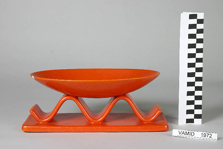Centrotavola (o fruttiera) decorato a smalto color arancio con effetto brillante. Base rettangolare su cui è fissato un supporto a onda sormontato da una coppa.