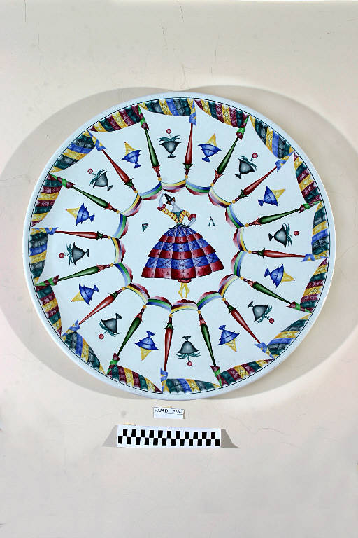 Grande piatto da parete con una figura femminile danzante (con veste rosso e blu) al centro e motivi a vasi scanditi a raggiera da elementi geometrici sulla tesa. Smaltato a colori vivaci su fondo bianco.