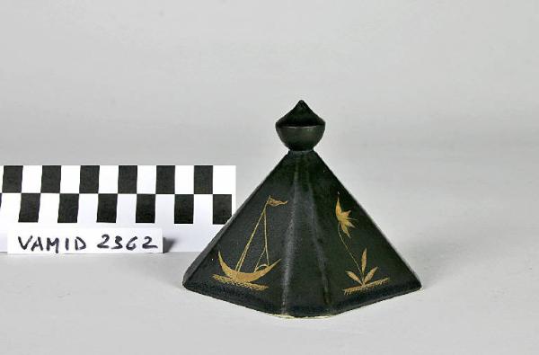 - NOTIZIE STORICO CRITICHE La scatola portasigari è decorata a terzo fuoco in oro opaco con paesaggi stilizzati. Una scatola simile, senza coperchio, è riportata nel catalogo delle ceramiche artistiche del 1939 della Società Ceramica Italiana Laveno come "portasigari Monza 65". Il recipiente è contrassegnato dal n. di inv. 2363, il coperchio dal n. 2362.