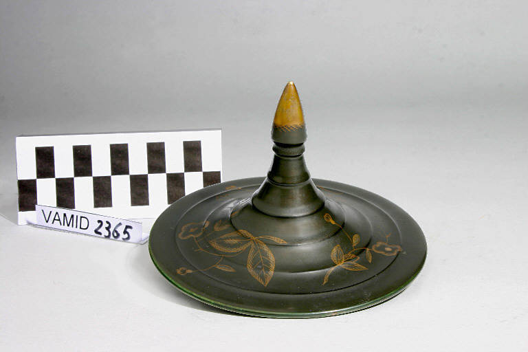Piccola scatola circolare con coperchio caratterizzato da un evidente manico a punta di lancia. Smalto nero con decorazioni in oro opaco.