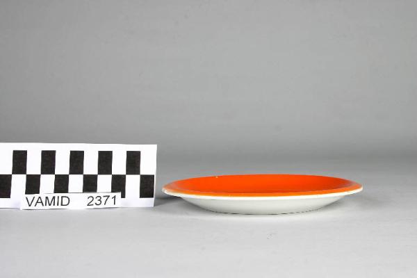 Piattino smaltato in rosso-arancione sulla faccia anteriore e lasciato nela colore bianco della pasta sul fondo.