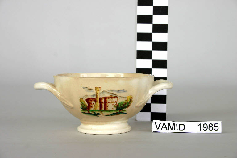 - NOTIZIE STORICO CRITICHE La zuccheriera (recipiente n. inv. 1985, coperchio n. inv. 1986) appartiene a un servizio da thè di "forma Pescara" o "forma Vecchia Milano". L'oggetto è decorato con transfer di colore marrone, colorato a mano sotto smalto in verde, giallo e azzurro.