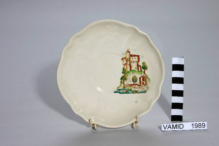 - NOTIZIE STORICO CRITICHE Il piattino appartiene a un servizio da thè di "forma Pescara" o "forma Vecchia Milano". L'oggetto è decorato con transfer di colore marrone, colorato a mano sotto smalto in verde, giallo e azzurro.