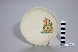 Piattino con bordo di forma irregolare. Decoro nei colori marrone, verde, giallo e azzurro su fondo bianco.