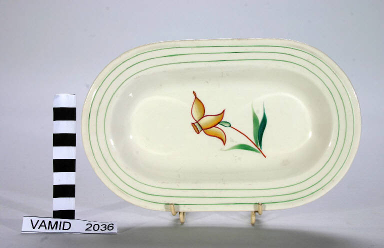 Raviera ovale con bordo liscio segnato da una triplice filettatura verde. Fondo bianco.