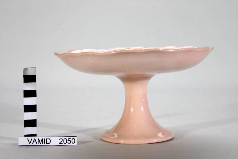 Fruttiera ad alzata in pasta rosa con piede circolare liscio sormontato da coppa bassa con orlo sagomato a otto petali.