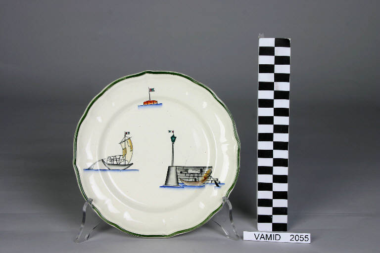 - NOTIZIE STORICO CRITICHE Il piatto, in serie con altri aventi decori diversi, fa parte di un servizio da tavola della forma "Vecchio Milano" con decoro "Lago Maggiore" n. 6641 (num. inv. 2051...3517). In questo esemplare sono raffigurati elementi caratteristici della vita sul lago (un attracco con scaletta e piante, un battello a vapore in navigazione e una boa luminosa) rappresentati in un'atmosfera sospesa e silenziosa, seppur ridente nella resa stilizzata e nel fresco cromatismo delle raffigurazioni. In terraglia forte il servizio "Vecchio Milano" venne prodotto dalla "S.C.I." a partire dal 1923. Il fatto che il decoro "Lago Maggiore" non sia riportato sul catalogo del 1926 induce a pensare che sia stato creato dall'Andlovitz dopo questa data. La sua ideazione, pertanto, viene a collocarsi molto probabilmente tra il 1926 e il 1927, cioè tra il catalogo aziendale e la nascita della nuova forma per la III Biennale di Monza. Nel 1931 l'Andlovitz, che fin dalla sua nomina a direttore artistico si prefisse di rigenerare le forme tradizionali con decori nuovi, adattò alla forma "Vecchio Milano" il nuovissimo decoro "Lago Maggiore", a conferma che una decorazione nuova, se concepita organicamente, può conferire un aspetto attuale e "scattante" anche a una bella forma tradizionale. Nell'ambito dei repertori decorativi creati dall'Andlovitz il decoro "Lago Maggiore" rappresenta un modo frazionato di raffigurare il paesaggio, definito da Mario Munari a "scena spezzata". L'impianto decorativo di queste ceramiche rifugge dalla centralità e dalle strutturazioni lungo direttrici ortogonali, mentre vi predominano l'asimmetria e le fughe visuali sghembe che risentono del gusto per la cineseria e il giapponismo. La semplificazione geometrica degli elementi e il modo di sfumare i corpi nel'intento di suggerirne la volumetria ricorda le opere di Carlo Carrà degli anni venti. Nel decoro "Lago Maggiore" sono presenti espressioni diversificate di un tema molto caro a Guido Andlovitz: i "paesaggi d'acqua" con particolare ricorrenza delle 'barche' raffigurate in una vasta gamma di tipi, generalmente riprese da modelli reali e con divertenti variazioni fantastiche. Il decoro "Lago" fu applicato in un primo momento sulla forma "Vecchio Milano", poi sulla forma "Pomezia" (1936 ca.). Di tale decoro esistono diversi disegni originali a matita, pastello, inchiostro e acquerello su carta conservati nel fondo archivistico della "S.C.I.": alcuni di questi raffigurano il decoro proprio sulla forma "Vecchio Milano" con le rifiniture che compaiono sui pezzi finiti. Nel Museo sono conservati anche un servizio da tavola (num. inv. 2667...2911) e un servizio da caffè (num. inv. 2672...2900) forma "Vecchio Milano" con decoro "Lago Maggiore" con filettaura policroma. Negli anni '90 la Richard Ginori ha rimesso in produzione il servizio "Lago". \nIl servizio in esame è eseguito a colaggio, mentre i decori sono realizzati a decalcomania e dipinti a mano: si vedano a tal proposito le lastre in rame acciaiato conservate nel Midec e raffiguranti molti dei decori presenti nel servizio in combinazioni diversificate (inv. 2480, 2483, 2484, 2485).\nIl piatto fa parte di una donazione di privati al Museo (Stoppani Piera).
