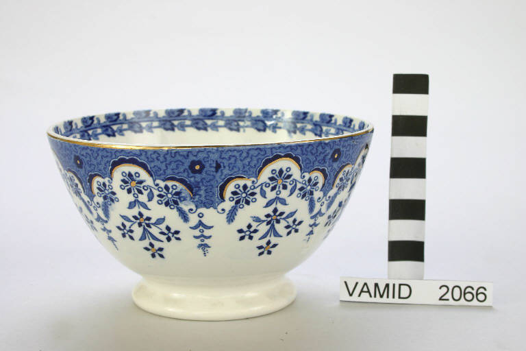 Ciotola bianca decorata all'esterno e sul bordo interno con motivi decorativi vegetali stilizzati in colore blu dalle diverse tonalità. Rifiniture in oro brillante.