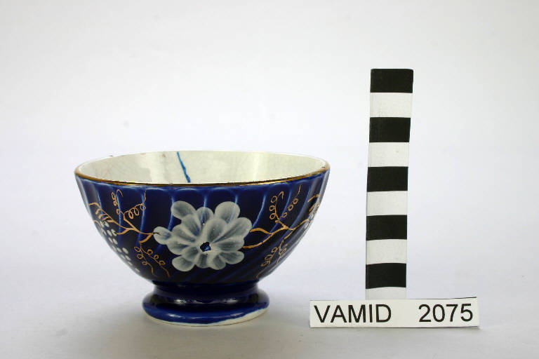 Ciotola a costole trasversali decorata all'esterno con smalto unito blu cobalto e ornati a fiori e grappoli d'uva in bianco e oro brillante. Rifiniture in oro brillante.