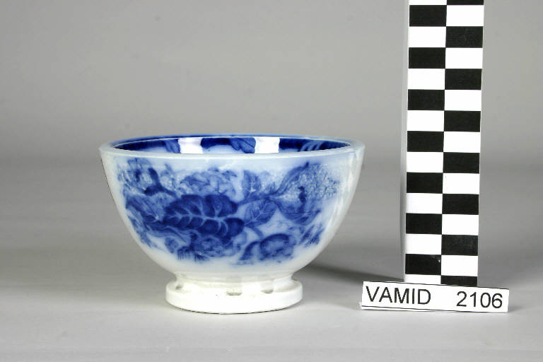 - NOTIZIE STORICO CRITICHE La ciotola, in biscotto duro, è decorata con foglie e fiori resi in modo libero e sfumato. La foggia dell'oggetto presenta spigoli vivi sia sul piede che sull'orlo della coppa.\nOggetti di forma simile sono presenti nelle tavole dei decori con dicitura "Tazzina Milano" (Busta 95, fascicolo 2 Archivio SCI).