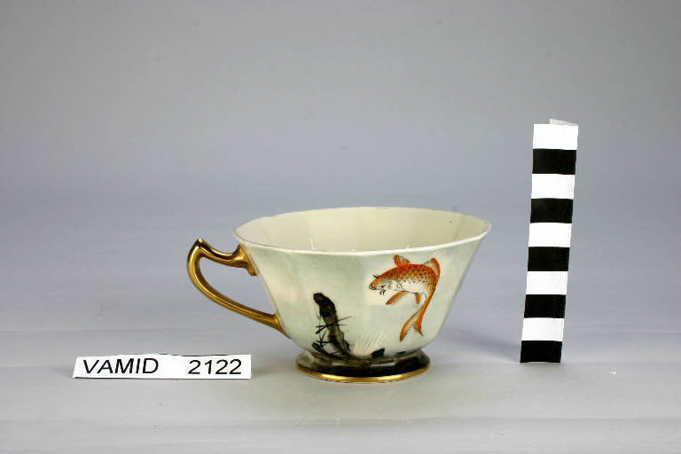 - NOTIZIE STORICO CRITICHE La foggia della tazza, appartenente ad un servizio da thè composto da ventisette elementi (num. inv. 2117...3645), suggerisce una datazione tra gli anni '30 e '40 del Novecento. La decorazione, come riporta l'iscrizione presente sul fondo di alcuni pezzi del servizio, è stata invece eseguita soprasmalto qualche anno più tardi (nel 1946) da Rosetta Tamburini, decoratrice attiva a Pesaro.