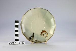 - NOTIZIE STORICO CRITICHE La foggia del piattino, appartenente ad un servizio da thè composto da ventisette elementi (num. inv. 2117...3645), suggerisce una datazione tra gli anni '30 e '40 del Novecento. La decorazione, come riporta l'iscrizione presente sul fondo di alcuni pezzi del servizio, è stata invece eseguita soprasmalto qualche anno più tardi (nel 1946) da Rosetta Tamburini, decoratrice attiva a Pesaro.