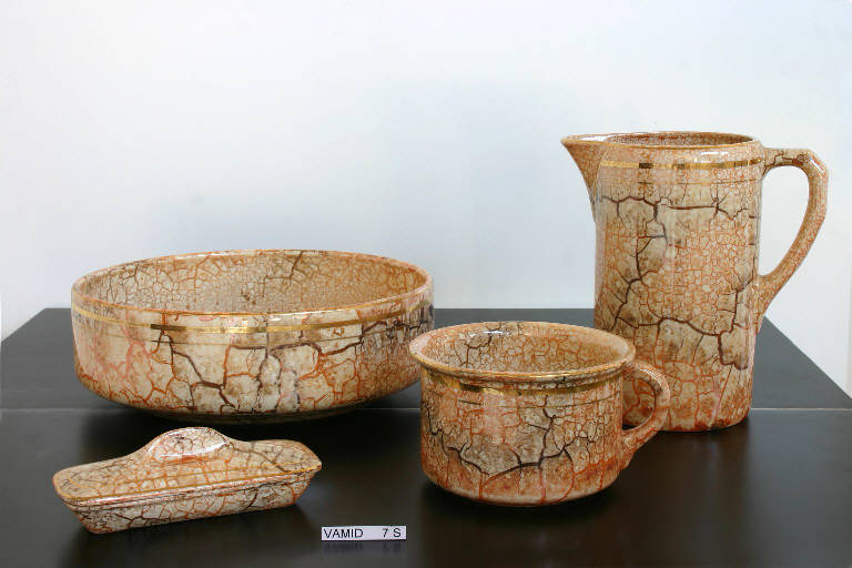 Servizio da camera composto da un pitale, un portasapone con coperchio, una brocca e un catino.