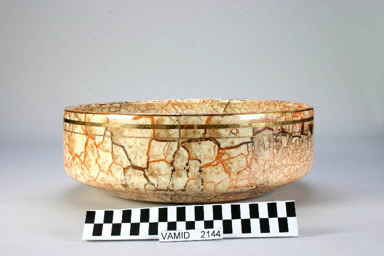 - NOTIZIE STORICO CRITICHE Il catino appartiene a un servizio decorato a finto marmo con una tecnica detta a lustro metallico. L'effetto era procurato con la semplice applicazione di un lustro metallico riflessato di colore similoro, che alla cottura reagiva in modo da formare una cracquelure (screpolatura) di smalti o colori ceramici. Si trattava quindi di una screpolatura realizzata artificialmente. L'esemplare è poi completato con colpi di pennello di colore bruno per accentuare la marmorizzazione. Viene quindi eseguita la rifinitura con oro brillante steso soprasmalto. La S. C. I. di Laveno realizzò un servizio dalla forma "Bengasi" molto simile a quella del servizio in esame, prodotto dalla manifattura francese di Sarreguemines.