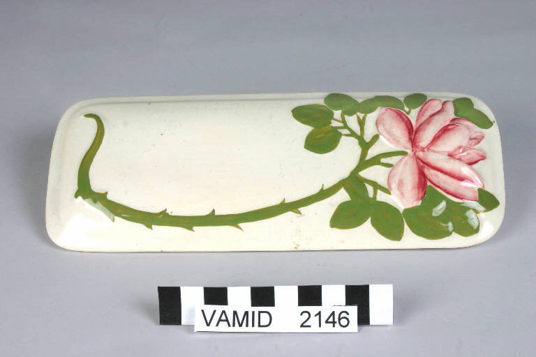 - NOTIZIE STORICO CRITICHE Il portasapone (recipiente inv. n. 2147, coperchio n. 2146) fa parte di un servizio in terraglia pasta avorio con decorazione floreale a bassorilievo miniata. Forma e decoro sono molto simili a un servizio da camera della forma denominata "Flora n. 5-6" prodotto dalla Società Ceramica Italiana di Laveno.