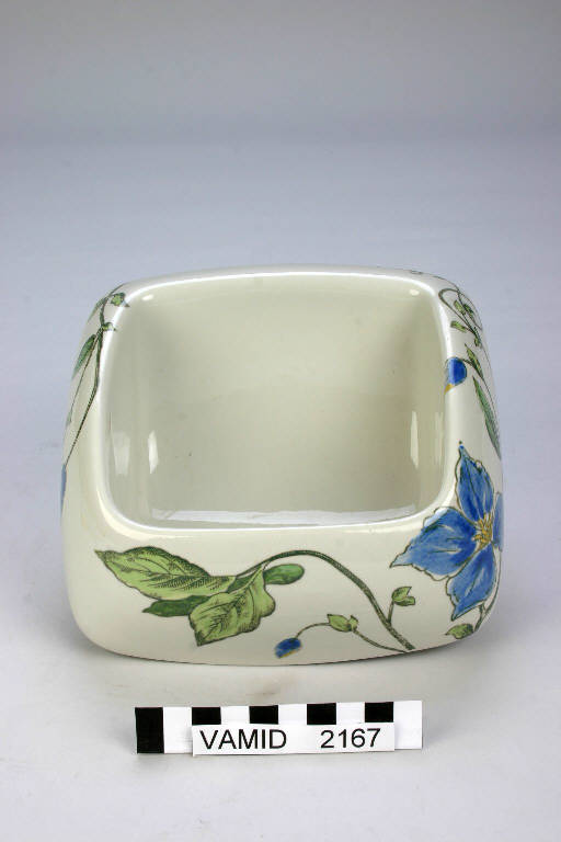 Portacarta igienica di forma quadrata e angoli arrotondati in pasta bianca con decoro a fiori blu e verde.