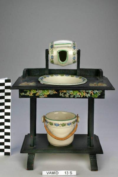 Servizio igienico da camera giocattolo composto da un mobiletto laccato di nero con decori a decoupage, un catino, un secchiello e un recipiente per la riserva d'acqua in terraglia tenera.
