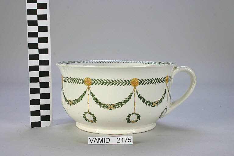 Pitale con manico, decorato in giallo e verde con motivi a festoni e ghirlande, bordura a foglioline.