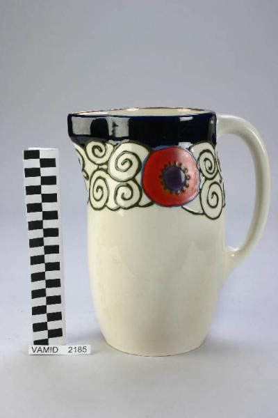 Brocca in terraglia pasta avorio decorata in blu cobalto e grigio con rifiniture in oro brillante. Inserti di colore verde, rosso, azzurro e viola.