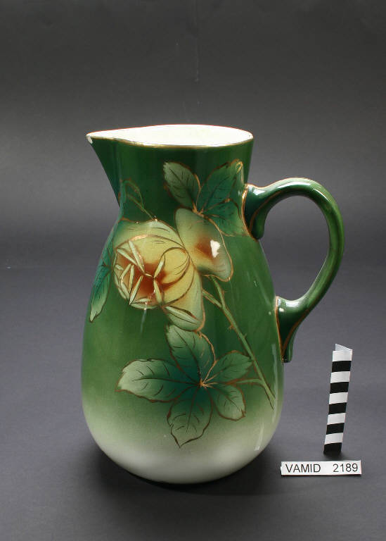 Brocca con rose e foglie su fondo verde sfumato con manico a "C"; lumeggiature e rifiniture in oro brillante.