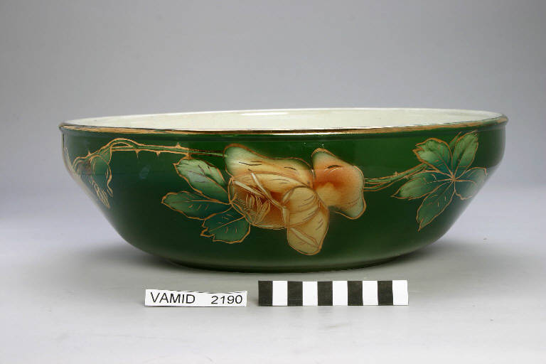 Catino lavamano con rose e foglie su fondo verde sfumato; lumeggiature e rifiniture in oro brillante.