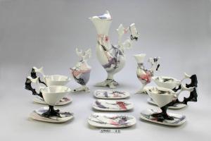 Servizio da thè di foggia fantastica in pasta bianca composto da una teiera, una lattiera, una zuccheriera, quattro tazze e sette piattini.