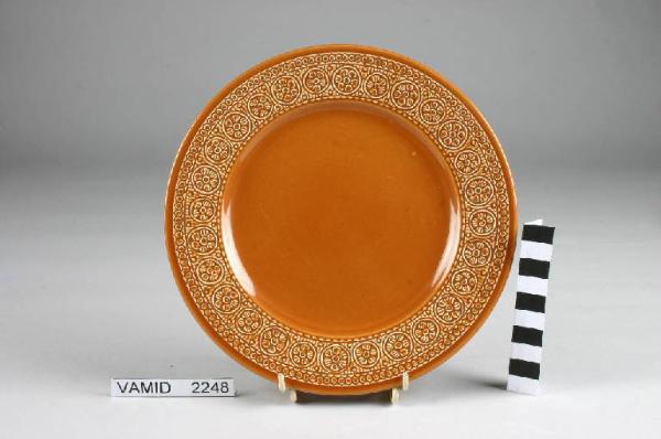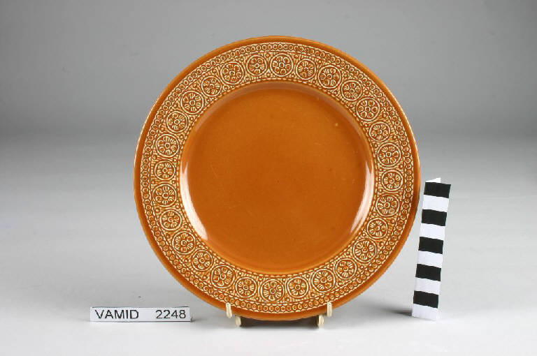 Piatto da frutta circolare color giallo aranciato; motivi decorativi geometrici e vegetali a rilievo lungo la tesa.