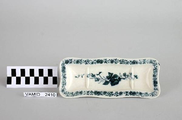 - NOTIZIE STORICO CRITICHE Il portasapone appartiene a un servizio igienico da camera decorato a stampa con transfer di colore blu applicati sotto smalto.Le prime manifatture a utilizzare la decorazione a stampa mediante una lastra di metallo incisa furono le francesi e le inglesi; certamente la Wedgwood, la notissima fabbrica di terraglie e porcellane inglesi, fu tra le prime ad ottenere risultati importanti in questa tecnica. la tecnica fu poi presto esportata in altri paesi europei.