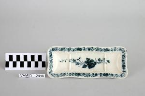 Portasapone rettangolare con orlo ondulato, fondo con due sporgenze per offrire maggiore aderenza al sapone; decoro in blu su fondo bianco.