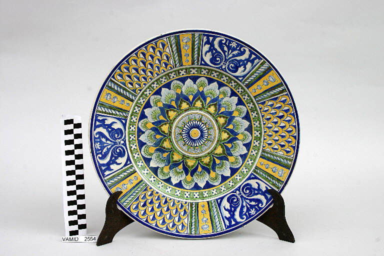 - NOTIZIE STORICO CRITICHE Il piatto reca a tergo il marchio della Ceramica Lodigiana e l'iscrizione "GIUSEPPINA SACCONAGHI", pittrice monzese del Novecento attiva nella scia del divisionismo ma anche disegnatrice e dedita all'incisione. Potrebbe essere avanzata l'ipotesi che Giuseppina Sacconaghi, detta Pina Sacconaghi, iscritta dal 1924 all'Accademia di Brera e assidua dei corsi di decorazione, si fosse cimentata nella decorazione ceramica nell'ambito della fiorente manifattura lodigiana. A Lodi sono attestate fornaci fin dal Medioevo e i suoi ceramisti furono richiesti anche fuori dalla loro patria. Il secolo XVIII segna l'apogeo della maiolica lodigiana. Al nome di Rossetti, noto anche in Piemonte e in Francia, si aggiungono altri nomi di celebri fabbricanti e decoratori, che si inserirono nel contesto europeo. I più importanti ateliers furono quelli dei discendenti dei Coppellotti e della famiglia Ferretti. Antonio Ferretti si segnala per le sue innovazioni tecnologiche: importò la tecnica del piccolo fuoco e i modelli decorativi tedeschi e francesi, rielaborati con squisita raffinatezza. Introdusse pure la terraglia come materiale plastico. Dopo la crisi post-napoleonica, la ceramica lodigiana ritornò in auge per opera dei Dossena (seconda metà del secolo XIX). Dopo il declino dei Dossena, all'inizio del Novecento, la tradizione lodigiana continuò con altre fabbriche, come quelle dei Vitali, dei Mamoli, dei Pallavicini, ed è sempre viva ai giorni nostri nei produttori e nelle istituzioni che ne sono i propagatori.