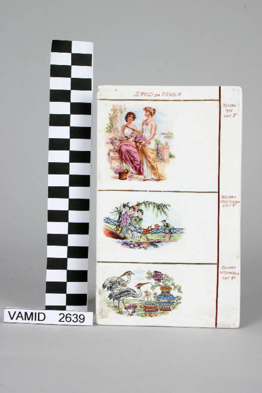 - NOTIZIE STORICO CRITICHE Piastrella realizzata a scopo di prova e come campionario dei decori prodotti dalla Società Ceramica Italiana di Laveno. Nel MIDC sono conservati diversi manufatti analoghi. La presenza della marca in verde con aquila ad ali spiegate e la scritta VERBANUM STONE indica una datazione entro il primo quarto del Novecento, considerato che intono al 1925 Guido Andlovitz fece sostituire tale marca con quella con la scritta Lavenia.