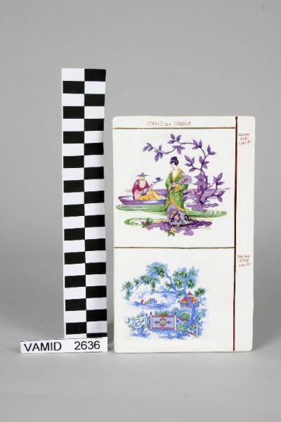 - NOTIZIE STORICO CRITICHE Piastrella realizzata a scopo di prova e come campionario dei decori prodotti dalla Società Ceramica Italiana di Laveno. Nel MIDC sono conservati diversi manufatti analoghi. La presenza della marca in verde con aquila ad ali spiegate e la scritta VERBANUM STONE indica una datazione entro il primo quarto del Novecento, considerato che intorno al 1925 Guido Andlovitz fece sostituire tale marca con quella con la scritta Lavenia. Tali ornati di gusto orientaleggiante, di cui il secondo deriva dalla terraglia inglese dell'Ottocento, rientrano in un gusto corrente protrattosi fino alla prima metà del XX secolo.