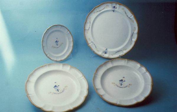 Servizio da tavola composto da undici piatti da frutta, quindici piatti piani, sette piatti fondi, due piatti da portata, una salsiera, una formaggera, una zuppiera e una insalatiera; forme leggermente sagomate e con superfici ondulate; decoro nei colori giallo carico e blu con casa stilizzata e iscrizioni entro cartigli.