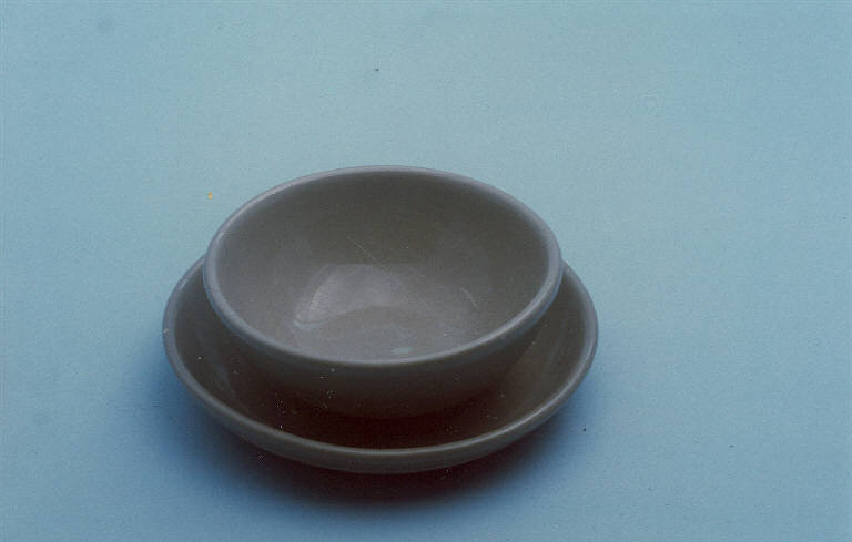 Piattino circolare; fondo grigio con parte superiore lucida e parte inferiore opaca.