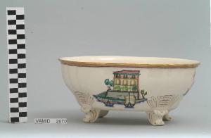 Insalatiera formata da un contenitore a forma ovale con orlo ondulato poggiante su quattro piedini a "C". Il fondo è bianco mentre i decori a smalti policromi raffigurano sui lati brevi reti ad asciugare sulle rive del lago, sui lati lunghi un palazzo e un porticciolo. L'orlo è dorato e rifinito esternamente da una piccola fascia smaltata a tratteggio incrociato in rosso, anche i piedini e il loro attacco a rilievo sul corpo del contenitore sono filettati in oro.