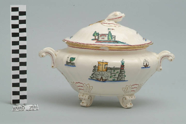 - NOTIZIE STORICO CRITICHE La zuppiera in esame fa parte del servizio forma "Vecchio Milano" con decoro "Lago Maggiore": vi sono raffigurati scorci minori del Lago maggiore, ricchi di fascino e di un'atmosfera sospesa e silenziosa, seppur ridente nella resa stilizzata e nel fresco cromatismo delle raffigurazioni. Fin dalla sua nomina a direttore artistico della "S.C.I.", Guido Andlovitz si prefisse di rigenerare le forme tradizionali con decori nuovi. E' il caso della forma "Vecchio Milano" cui adattò nel 1931 il nuovissimo decoro "Lago Maggiore", a conferma che una decorazione nuova, se concepita organicamente, può conferire un aspetto attuale e "scattante" anche a una bella forma tradizionale. Fu certamente uno dei servizi più prestigiosi della produzione del momento se Andlovitz lo concepì in piccolissima serie e se l'azienda gli consentì - caso unico- di firmarlo nella marca. La scritta Verbano e la data 1931 presenti nel marchio suggeriscono che probabilmente il servizio fu realizzato per celebrare nel 1931 l'inizio della produzione di porcellana da tavola a Laveno nello stabilimento Verbano. Nell'ambito dei repertori decorativi creati dall'Andlovtz il decoro "Lago Maggiore" rappresenta un modo frazionato di raffigurare il paesaggio, definito da Mario Munari a "scena spezzata". L'impianto decorativo di queste ceramiche rifugge dalla centralità e dalla strutturazioni lungo diretrici ortogonali, mentre vi predominano l'asimmetria e le fughe visuali sghembe che risentono del gusto per la cineseria e il giapponismo. La semplificazione geometrica degli elementi e il modo di sfumare i corpi nel'intento di suggerirne la volumetria ricorda le opere di Carlo Carrà degli anni venti. Nel decoro "Lago Maggiore" sono presenti espressioni diversificate di un tema molto caro a Guido Andlovitz: i "paesaggi d'acqua" con particolare ricorrenza delle 'barche' raffigurate in una vasta gamma di tipi, generalmente riprese da modelli reali e con divertenti variazioni fantastiche. Il decoro Lago fu applicato in un primo momento sulla forma "Vecchio Milano", poi sulla forma "Pomezia" (1936 ca.). Del decoro Lago esistono diversi disegni originali a matita, pastello, inchiostro e acquerello su carta conservati nel fondo archivistico della "S.C.I.": alcuni di questi raffigurano il decoro proprio sulla forma "Vecchio Milano" con le rifiniture che compaiono sui pezzi finiti. Nel Museo è conservato anche un altro servizio forma "Vecchio Milano" con decoro "Lago Maggiore", ma più ridotto nella quantità e nella varietà dei componenti e con filettatura monocroma (num. inv. 2051...3517). Negli anni '90 la Richard Ginori ha rimesso in produzione il servizio Lago.\nIl servizio in esame è eseguito a colaggio, mentre i decori sono realizzati a decalcomania (o transfer): si vedano in proposito le lastre in rame acciaiato conservate nel Museo e raffiguranti molti dei decori presenti nel servizio in combinazioni diversificate (nn. inv. 2480, 2483, 2484, 2485). Tipologicamente si lega ad un servizio da caffé (num. inv. 2672...2900).\nLa zuppiera è stata donata da Vanna Scotti Meregalli, nipote di Vanna Scotti, figlia dell'Ing. Luciano Scotti che fu direttore generale della "S.C.I." dal 1916.
