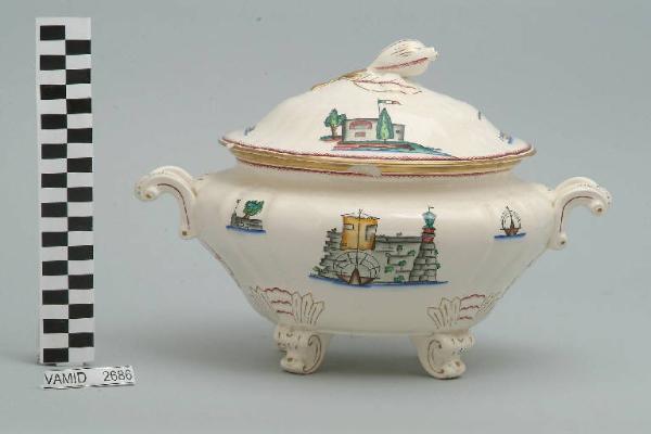 Zuppiera formata da un contenitore a forma ovale con corpo sagomato e panciuto e l'orlo estroflesso e ondulato. Il recipiente poggia su quattro piedini a voluta a "C" ed è fornito di due manici, anch'essi a "C", applicati sui lati brevi. Il coperchio presenta una bombatura pronunciata e un frutto modellato a tutto tondo come presa apicale. Il fondo è bianco mentre i decori a smalti policromi sono distribuiti sulle due facce principali del recipiente e sulla superficie esterna del coperchio. Gli orli sono dorati e rifiniti esternamente da una piccola fascia smaltata a tratteggio incrociato in rosso; anche i piedini, i loro attacchi a rilievo a forma di foglie e i manici sono rifiniti con filettature in rosso e in oro.