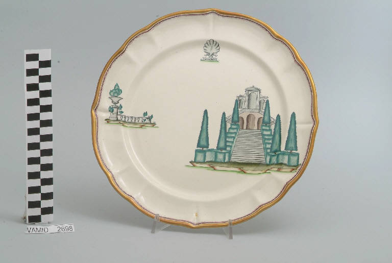 - NOTIZIE STORICO CRITICHE Il piatto da portata in esame fa parte del servizio forma "Vecchio Milano" con decoro "Lago Maggiore": vi sono raffigurati scorci minori (un giardino all'italiana con esedra sullo sfondo da identificarsi probabilmente con quello della Villa Bozzolo a Casalzuigno, una balaustrata con vaso, sempre ripresa probabilmente dal giardino Bozzolo) e un elemento portato a simbolo dell''anima' del Lago Maggiore (un elemento scultoreo con valva di conchiglia sostenuta da due delfini, presente in similari accezioni nell'arredo di alcuni giardini antichi della zona), rappresentati in un'atmosfera sospesa e silenziosa, seppur ridente nella resa stilizzata e nel fresco cromatismo delle raffigurazioni. Fin dalla sua nomina a direttore artistico della "S.C.I.", Guido Andlovitz si prefisse di rigenerare le forme tradizionali con decori nuovi. E' il caso della forma "Vecchio Milano" cui adattò nel 1931 il nuovissimo decoro "Lago Maggiore", a conferma che una decorazione nuova, se concepita organicamente, può conferire un aspetto attuale e "scattante" anche a una bella forma tradizionale. Fu certamente uno dei servizi più prestigiosi della produzione del momento se Andlovitz lo concepì in piccolissima serie e se l'azienda gli consentì - caso unico- di firmarlo nella marca. La scritta Verbano e la data 1931 presenti nel marchio suggeriscono che probabilmente il servizio fu realizzato per celebrare nel 1931 l'inizio della produzione di porcellana da tavola a Laveno nello stabilimento Verbano. Nell'ambito dei repertori decorativi creati dall'Andlovtz il decoro "Lago Maggiore" rappresenta un modo frazionato di raffigurare il paesaggio, definito da Mario Munari a "scena spezzata". L'impianto decorativo di queste ceramiche rifugge dalla centralità e dalla strutturazioni lungo diretrici ortogonali, mentre vi predominano l'asimmetria e le fughe visuali sghembe che risentono del gusto per la cineseria e il giapponismo. La semplificazione geometrica degli elementi e il modo di sfumare i corpi nel'intento di suggerirne la volumetria ricorda le opere di Carlo Carrà degli anni venti. Nel decoro "Lago Maggiore" sono presenti espressioni diversificate di un tema molto caro a Guido Andlovitz: i "paesaggi d'acqua" con particolare ricorrenza delle 'barche' raffigurate in una vasta gamma di tipi, generalmente riprese da modelli reali e con divertenti variazioni fantastiche. Il decoro Lago fu applicato in un primo momento sulla forma "Vecchio Milano", poi sulla forma "Pomezia" (1936 ca.). Del decoro Lago esistono diversi disegni originali a matita, pastello, inchiostro e acquerello su carta conservati nel fondo archivistico della "S.C.I.": alcuni di questi raffigurano il decoro proprio sulla forma "Vecchio Milano" con le rifiniture che compaiono sui pezzi finiti. Nel Museo è conservato anche un altro servizio forma "Vecchio Milano" con decoro "Lago Maggiore", ma più ridotto nella quantità e nella varietà dei componenti e con filettatura monocroma (num. inv. 2051...3517). Negli anni '90 la Richard Ginori ha rimesso in produzione il servizio Lago.\nIl servizio in esame è eseguito a colaggio, mentre i decori sono realizzati a decalcomania (o transfer): si vedano in proposito le lastre in rame acciaiato conservate nel Museo e raffiguranti molti dei decori presenti nel servizio in combinazioni diversificate (nn. inv. 2480, 2483, 2484, 2485). Tipologicamente si lega ad un servizio da caffé (num. inv. 2672...2900).\nIl piatto da portata è stato donato da Vanna Scotti Meregalli, nipote di Vanna Scotti, figlia dell'Ing. Luciano Scotti che fu direttore generale della "S.C.I." dal 1916.