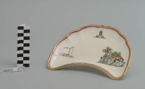 Piatto lunetta con fondo leggeremente concavo e l'orlo ondulato. Il fondo è bianco mentre i decori sono a smalti policromi e sono collocati ai due lati della falce di luna e al centro in alto. L'orlo è dorato e rifinito da una piccola fascia smaltata a tratteggio incrociato in rosso.
