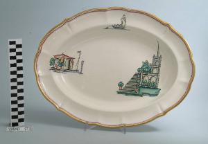 - NOTIZIE STORICO CRITICHE Il piatto da portata ovale in esame fa parte del servizio forma "Vecchio Milano" con decoro "Lago Maggiore": vi sono raffigurati uno scorcio del Lago Maggiore (una veduta laterale del ninfeo del palazzo Borromeo nell'Isola Bella) ed elementi caratteristici della vita sul lago (uno scoglio con piccolo edificio e una barca a vela in avvicinamento, un'altra barca da pesca tipica, detta burchiello) rappresentati in un'atmosfera sospesa e silenziosa, seppur ridente nella resa stilizzata e nel fresco cromatismo delle raffigurazioni. Fin dalla sua nomina a direttore artistico della "S.C.I.", Guido Andlovitz si prefisse di rigenerare le forme tradizionali con decori nuovi. E' il caso della forma "Vecchio Milano" cui adattò nel 1931 il nuovissimo decoro "Lago Maggiore", a conferma che una decorazione nuova, se concepita organicamente, può conferire un aspetto attuale e "scattante" anche a una bella forma tradizionale. Fu certamente uno dei servizi più prestigiosi della produzione del momento se Andlovitz lo concepì in piccolissima serie e se l'azienda gli consentì - caso unico- di firmarlo nella marca. La scritta Verbano e la data 1931 presenti nel marchio suggeriscono che probabilmente il servizio fu realizzato per celebrare nel 1931 l'inizio della produzione di porcellana da tavola a Laveno nello stabilimento Verbano. Nell'ambito dei repertori decorativi creati dall'Andlovtz il decoro "Lago Maggiore" rappresenta un modo frazionato di raffigurare il paesaggio, definito da Mario Munari a "scena spezzata". L'impianto decorativo di queste ceramiche rifugge dalla centralità e dalla strutturazioni lungo diretrici ortogonali, mentre vi predominano l'asimmetria e le fughe visuali sghembe che risentono del gusto per la cineseria e il giapponismo. La semplificazione geometrica degli elementi e il modo di sfumare i corpi nel'intento di suggerirne la volumetria ricorda le opere di Carlo Carrà degli anni venti. Nel decoro "Lago Maggiore" sono presenti espressioni diversificate di un tema molto caro a Guido Andlovitz: i "paesaggi d'acqua" con particolare ricorrenza delle 'barche' raffigurate in una vasta gamma di tipi, generalmente riprese da modelli reali e con divertenti variazioni fantastiche. Il decoro Lago fu applicato in un primo momento sulla forma "Vecchio Milano", poi sulla forma "Pomezia" (1936 ca.). Del decoro Lago esistono diversi disegni originali a matita, pastello, inchiostro e acquerello su carta conservati nel fondo archivistico della "S.C.I.": alcuni di questi raffigurano il decoro proprio sulla forma "Vecchio Milano" con le rifiniture che compaiono sui pezzi finiti. Nel Museo è conservato anche un altro servizio forma "Vecchio Milano" con decoro "Lago Maggiore", ma più ridotto nella quantità e nella varietà dei componenti e con filettatura monocroma (num. inv. 2051...3517). Negli anni '90 la Richard Ginori ha rimesso in produzione il servizio Lago.\nIl servizio in esame è eseguito a colaggio, mentre i decori sono realizzati a decalcomania (o transfer): si vedano in proposito le lastre in rame acciaiato conservate nel Museo e raffiguranti molti dei decori presenti nel servizio in combinazioni diversificate (nn. inv. 2480, 2483, 2484, 2485). Tipologicamente si lega ad un servizio da caffé (num. inv. 2672...2900).\nIl piatto da portata è stato donato da Vanna Scotti Meregalli, nipote di Vanna Scotti, figlia dell'Ing. Luciano Scotti che fu direttore generale della "S.C.I." dal 1916.
