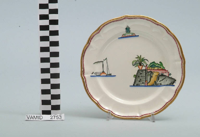 - NOTIZIE STORICO CRITICHE Il piatto da formaggio in esame fa parte del servizio forma "Vecchio Milano" con decoro "Lago Maggiore": vi sono raffigurati elementi caratteristici della vita sul lago (un attracco con scaletta e piante, un battello a vapore in navigazione e una boa luminosa) rappresentati in un'atmosfera sospesa e silenziosa, seppur ridente nella resa stilizzata e nel fresco cromatismo delle raffigurazioni. Fin dalla sua nomina a direttore artistico della "S.C.I.", Guido Andlovitz si prefisse di rigenerare le forme tradizionali con decori nuovi. E' il caso della forma "Vecchio Milano" cui adattò nel 1931 il nuovissimo decoro "Lago Maggiore", a conferma che una decorazione nuova, se concepita organicamente, può conferire un aspetto attuale e "scattante" anche a una bella forma tradizionale. Fu certamente uno dei servizi più prestigiosi della produzione del momento se Andlovitz lo concepì in piccolissima serie e se l'azienda gli consentì - caso unico- di firmarlo nella marca. La scritta Verbano e la data 1931 presenti nel marchio suggeriscono che probabilmente il servizio fu realizzato per celebrare nel 1931 l'inizio della produzione di porcellana da tavola a Laveno nello stabilimento Verbano. Nell'ambito dei repertori decorativi creati dall'Andlovtz il decoro "Lago Maggiore" rappresenta un modo frazionato di raffigurare il paesaggio, definito da Mario Munari a "scena spezzata". L'impianto decorativo di queste ceramiche rifugge dalla centralità e dalla strutturazioni lungo diretrici ortogonali, mentre vi predominano l'asimmetria e le fughe visuali sghembe che risentono del gusto per la cineseria e il giapponismo. La semplificazione geometrica degli elementi e il modo di sfumare i corpi nel'intento di suggerirne la volumetria ricorda le opere di Carlo Carrà degli anni venti. Nel decoro "Lago Maggiore" sono presenti espressioni diversificate di un tema molto caro a Guido Andlovitz: i "paesaggi d'acqua" con particolare ricorrenza delle 'barche' raffigurate in una vasta gamma di tipi, generalmente riprese da modelli reali e con divertenti variazioni fantastiche. Il decoro Lago fu applicato in un primo momento sulla forma "Vecchio Milano", poi sulla forma "Pomezia" (1936 ca.). Del decoro Lago esistono diversi disegni originali a matita, pastello, inchiostro e acquerello su carta conservati nel fondo archivistico della "S.C.I.": alcuni di questi raffigurano il decoro proprio sulla forma "Vecchio Milano" con le rifiniture che compaiono sui pezzi finiti. Nel Museo è conservato anche un altro servizio forma "Vecchio Milano" con decoro "Lago Maggiore", ma più ridotto nella quantità e nella varietà dei componenti e con filettatura monocroma (num. inv. 2051...3517). Negli anni '90 la Richard Ginori ha rimesso in produzione il servizio Lago.\nIl servizio in esame è eseguito a colaggio, mentre i decori sono realizzati a decalcomania (o transfer): si vedano in proposito le lastre in rame acciaiato conservate nel Museo e raffiguranti molti dei decori presenti nel servizio in combinazioni diversificate (nn. inv. 2480, 2483, 2484, 2485). Tipologicamente si lega ad un servizio da caffé (num. inv. 2672...2900).\nIl piatto da formaggio è stato donato da Vanna Scotti Meregalli, nipote di Vanna Scotti, figlia dell'Ing. Luciano Scotti che fu direttore generale della "S.C.I." dal 1916.