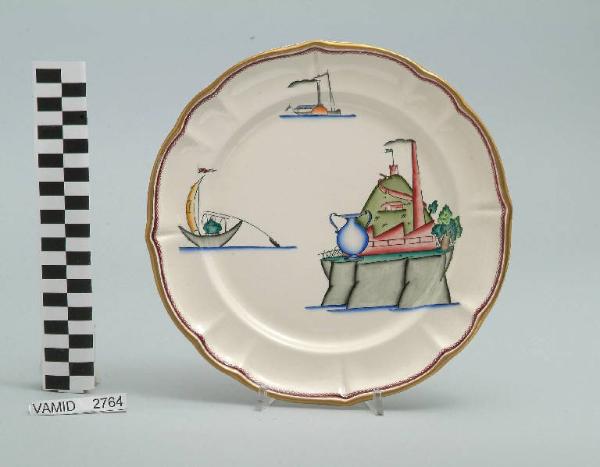 - NOTIZIE STORICO CRITICHE Il piatto piano in esame fa parte del servizio forma "Vecchio Milano" con decoro "Lago Maggiore": vi è raffigurata, oltre ai soliti elementi caratteristici del lago, una veduta fortemente simbolica, attorno alla quale ruotano tutte le altre vedute presenti sul servizio: è la veduta dello stabilimento Verbano della S. C. I. di Laveno, che fu inaugurato in quell'anno e che fu l'occasione per la realizzazione del servizio in oggetto. L'orgoglio per la produzione lavenese di vasellame e stoviglie, riconosciuta in quel momento tra le migliori d'Europa, è sottolineato anche dalla presenza di un vaso gigantesco adagiato sul prato antistante la fabbrica e di una zuppiera all'interno della barca da pesca sulla sinistra. Questi decori, per i quali esiste un bel disegno preparatorio autografo (cfr. "Guido Andlovitz. La commedia ceramica...," 1993, p. 19), sono rappresentati in un'atmosfera sospesa e silenziosa, seppur ridente nella resa stilizzata e nel fresco cromatismo delle raffigurazioni. Fin dalla sua nomina a direttore artistico della "S.C.I.", Guido Andlovitz si prefisse di rigenerare le forme tradizionali con decori nuovi. E' il caso della forma "Vecchio Milano" cui adattò nel 1931 il nuovissimo decoro "Lago Maggiore", a conferma che una decorazione nuova, se concepita organicamente, può conferire un aspetto attuale e "scattante" anche a una bella forma tradizionale. Fu certamente uno dei servizi più prestigiosi della produzione del momento se Andlovitz lo concepì in piccolissima serie e se l'azienda gli consentì - caso unico- di firmarlo nella marca. La scritta Verbano e la data 1931 presenti nel marchio suggeriscono che probabilmente il servizio fu realizzato per celebrare nel 1931 l'inizio della produzione di porcellana da tavola a Laveno nello stabilimento Verbano. Nell'ambito dei repertori decorativi creati dall'Andlovtz il decoro "Lago Maggiore" rappresenta un modo frazionato di raffigurare il paesaggio, definito da Mario Munari a "scena spezzata". L'impianto decorativo di queste ceramiche rifugge dalla centralità e dalla strutturazioni lungo diretrici ortogonali, mentre vi predominano l'asimmetria e le fughe visuali sghembe che risentono del gusto per la cineseria e il giapponismo. La semplificazione geometrica degli elementi e il modo di sfumare i corpi nel'intento di suggerirne la volumetria ricorda le opere di Carlo Carrà degli anni venti. Nel decoro "Lago Maggiore" sono presenti espressioni diversificate di un tema molto caro a Guido Andlovitz: i "paesaggi d'acqua" con particolare ricorrenza delle 'barche' raffigurate in una vasta gamma di tipi, generalmente riprese da modelli reali e con divertenti variazioni fantastiche. Il decoro Lago fu applicato in un primo momento sulla forma "Vecchio Milano", poi sulla forma "Pomezia" (1936 ca.). Del decoro Lago esistono diversi disegni originali a matita, pastello, inchiostro e acquerello su carta conservati nel fondo archivistico della "S.C.I.": alcuni di questi raffigurano il decoro proprio sulla forma "Vecchio Milano" con le rifiniture che compaiono sui pezzi finiti. Nel Museo è conservato anche un altro servizio forma "Vecchio Milano" con decoro "Lago Maggiore", ma più ridotto nella quantità e nella varietà dei componenti e con filettatura monocroma (num. inv. 2051...3517). Negli anni '90 la Richard Ginori ha rimesso in produzione il servizio Lago.\nIl servizio in esame è eseguito a colaggio, mentre i decori sono realizzati a decalcomania (o transfer): si vedano in proposito le lastre in rame acciaiato conservate nel Museo e raffiguranti molti dei decori presenti nel servizio in combinazioni diversificate (nn. inv. 2480, 2483, 2484, 2485). Tipologicamente si lega ad un servizio da caffé (num. inv. 2672...2900).\nIl piatto piano è stato donato da Vanna Scotti Meregalli, nipote di Vanna Scotti, figlia dell'Ing. Luciano Scotti che fu direttore generale della "S.C.I." dal 1916.