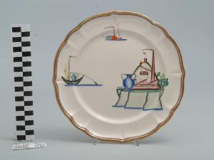 - NOTIZIE STORICO CRITICHE Il piatto piano in esame fa parte del servizio forma "Vecchio Milano" con decoro "Lago Maggiore": vi è raffigurata, oltre ai soliti elementi caratteristici del lago, una veduta fortemente simbolica, attorno alla quale ruotano tutte le altre vedute presenti sul servizio: è la veduta dello stabilimento Verbano della S. C. I. di Laveno, che fu inaugurato in quell'anno e che fu l'occasione per la realizzazione del servizio in oggetto. L'orgoglio per la produzione lavenese di vasellame e stoviglie, riconosciuta in quel momento tra le migliori d'Europa, è sottolineato anche dalla presenza di un vaso gigantesco adagiato sul prato antistante la fabbrica e di una zuppiera all'interno della barca da pesca sulla sinistra. Questi decori, per i quali esiste un bel disegno preparatorio autografo (cfr. "Guido Andlovitz. La commedia ceramica...," 1993, p. 19), sono rappresentati in un'atmosfera sospesa e silenziosa, seppur ridente nella resa stilizzata e nel fresco cromatismo delle raffigurazioni. Fin dalla sua nomina a direttore artistico della "S.C.I.", Guido Andlovitz si prefisse di rigenerare le forme tradizionali con decori nuovi. E' il caso della forma "Vecchio Milano" cui adattò nel 1931 il nuovissimo decoro "Lago Maggiore", a conferma che una decorazione nuova, se concepita organicamente, può conferire un aspetto attuale e "scattante" anche a una bella forma tradizionale. Fu certamente uno dei servizi più prestigiosi della produzione del momento se Andlovitz lo concepì in piccolissima serie e se l'azienda gli consentì - caso unico- di firmarlo nella marca. La scritta Verbano e la data 1931 presenti nel marchio suggeriscono che probabilmente il servizio fu realizzato per celebrare nel 1931 l'inizio della produzione di porcellana da tavola a Laveno nello stabilimento Verbano. Nell'ambito dei repertori decorativi creati dall'Andlovtz il decoro "Lago Maggiore" rappresenta un modo frazionato di raffigurare il paesaggio, definito da Mario Munari a "scena spezzata". L'impianto decorativo di queste ceramiche rifugge dalla centralità e dalla strutturazioni lungo diretrici ortogonali, mentre vi predominano l'asimmetria e le fughe visuali sghembe che risentono del gusto per la cineseria e il giapponismo. La semplificazione geometrica degli elementi e il modo di sfumare i corpi nel'intento di suggerirne la volumetria ricorda le opere di Carlo Carrà degli anni venti. Nel decoro "Lago Maggiore" sono presenti espressioni diversificate di un tema molto caro a Guido Andlovitz: i "paesaggi d'acqua" con particolare ricorrenza delle 'barche' raffigurate in una vasta gamma di tipi, generalmente riprese da modelli reali e con divertenti variazioni fantastiche. Il decoro Lago fu applicato in un primo momento sulla forma "Vecchio Milano", poi sulla forma "Pomezia" (1936 ca.). Del decoro Lago esistono diversi disegni originali a matita, pastello, inchiostro e acquerello su carta conservati nel fondo archivistico della "S.C.I.": alcuni di questi raffigurano il decoro proprio sulla forma "Vecchio Milano" con le rifiniture che compaiono sui pezzi finiti. Nel Museo è conservato anche un altro servizio forma "Vecchio Milano" con decoro "Lago Maggiore", ma più ridotto nella quantità e nella varietà dei componenti e con filettatura monocroma (num. inv. 2051...3517). Negli anni '90 la Richard Ginori ha rimesso in produzione il servizio Lago.\nIl servizio in esame è eseguito a colaggio, mentre i decori sono realizzati a decalcomania (o transfer): si vedano in proposito le lastre in rame acciaiato conservate nel Museo e raffiguranti molti dei decori presenti nel servizio in combinazioni diversificate (nn. inv. 2480, 2483, 2484, 2485). Tipologicamente si lega ad un servizio da caffé (num. inv. 2672...2900).\nIl piatto piano è stato donato da Vanna Scotti Meregalli, nipote di Vanna Scotti, figlia dell'Ing. Luciano Scotti che fu direttore generale della "S.C.I." dal 1916.