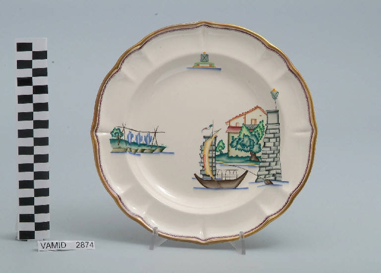 - NOTIZIE STORICO CRITICHE Il piatto fondo in esame fa parte del servizio forma "Vecchio Milano" con decoro "Lago Maggiore": vi sono raffigurati uno scorcio minore con una barca da pesca tipica che sta entrando in un porticciolo privato con una villetta che si vede oltre il muro di cinta e alcuni elementi caratteristici della vita sul lago (l'essiccazione del pesce al sole sulla riva del lago e una boa luminosa), rappresentati in un'atmosfera sospesa e silenziosa, seppur ridente nella resa stilizzata e nel fresco cromatismo delle raffigurazioni. Fin dalla sua nomina a direttore artistico della "S.C.I.", Guido Andlovitz si prefisse di rigenerare le forme tradizionali con decori nuovi. E' il caso della forma "Vecchio Milano" cui adattò nel 1931 il nuovissimo decoro "Lago Maggiore", a conferma che una decorazione nuova, se concepita organicamente, può conferire un aspetto attuale e "scattante" anche a una bella forma tradizionale. Fu certamente uno dei servizi più prestigiosi della produzione del momento se Andlovitz lo concepì in piccolissima serie e se l'azienda gli consentì - caso unico- di firmarlo nella marca. La scritta Verbano e la data 1931 presenti nel marchio suggeriscono che probabilmente il servizio fu realizzato per celebrare nel 1931 l'inizio della produzione di porcellana da tavola a Laveno nello stabilimento Verbano. Nell'ambito dei repertori decorativi creati dall'Andlovtz il decoro "Lago Maggiore" rappresenta un modo frazionato di raffigurare il paesaggio, definito da Mario Munari a "scena spezzata". L'impianto decorativo di queste ceramiche rifugge dalla centralità e dalla strutturazioni lungo diretrici ortogonali, mentre vi predominano l'asimmetria e le fughe visuali sghembe che risentono del gusto per la cineseria e il giapponismo. La semplificazione geometrica degli elementi e il modo di sfumare i corpi nel'intento di suggerirne la volumetria ricorda le opere di Carlo Carrà degli anni venti. Nel decoro "Lago Maggiore" sono presenti espressioni diversificate di un tema molto caro a Guido Andlovitz: i "paesaggi d'acqua" con particolare ricorrenza delle 'barche' raffigurate in una vasta gamma di tipi, generalmente riprese da modelli reali e con divertenti variazioni fantastiche. Il decoro Lago fu applicato in un primo momento sulla forma "Vecchio Milano", poi sulla forma "Pomezia" (1936 ca.). Del decoro Lago esistono diversi disegni originali a matita, pastello, inchiostro e acquerello su carta conservati nel fondo archivistico della "S.C.I.": alcuni di questi raffigurano il decoro proprio sulla forma "Vecchio Milano" con le rifiniture che compaiono sui pezzi finiti. Nel Museo è conservato anche un altro servizio forma "Vecchio Milano" con decoro "Lago Maggiore", ma più ridotto nella quantità e nella varietà dei componenti e con filettatura monocroma (num. inv. 2051...3517). Negli anni '90 la Richard Ginori ha rimesso in produzione il servizio Lago.\nIl servizio in esame è eseguito a colaggio, mentre i decori sono realizzati a decalcomania (o transfer): si vedano in proposito le lastre in rame acciaiato conservate nel Museo e raffiguranti molti dei decori presenti nel servizio in combinazioni diversificate (nn. inv. 2480, 2483, 2484, 2485). Tipologicamente si lega ad un servizio da caffé (num. inv. 2672...2900).\nIl piatto fondo è stato donato da Vanna Scotti Meregalli, nipote di Vanna Scotti, figlia dell'Ing. Luciano Scotti che fu direttore generale della "S.C.I." dal 1916.