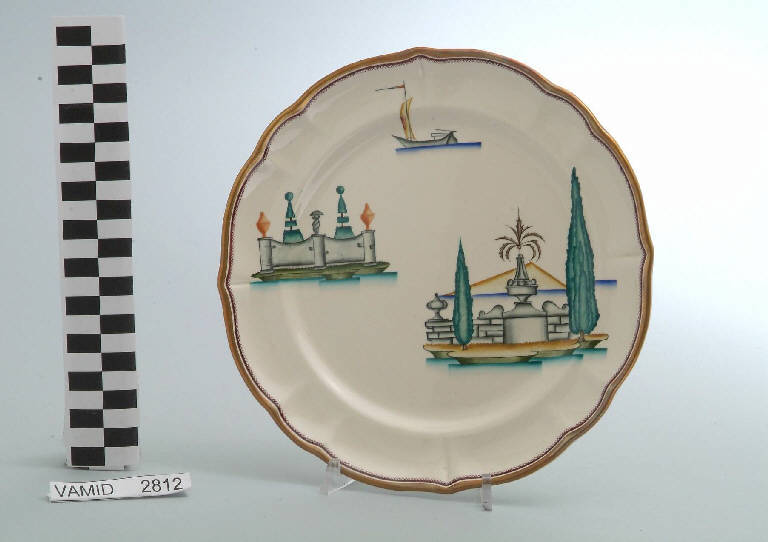 - NOTIZIE STORICO CRITICHE Il piatto da frutta in esame fa parte del servizio forma "Vecchio Milano" con decoro "Lago Maggiore": vi sono raffigurati una veduta di un giardino all'italiana che si affaccia sul lago e che è caratterizzato da una fontana in pietra, cipressi potati secondo l'ars topiaria ed elementi decorativi anch'essi in pietra che arricchiscono il parapetto sul lago. Insieme alla veduta, oltre allla solita barca a vela sospinta dal vento, è presente un altro decoro riferito ai giardini del lago: una recinzione in muratuta con vasi decorativi da cui spuntano due cipressi 'topiarizzati'. Per il suo clima mite e la posizione amena e soleggiata il Lago Maggiore è da sempre luogo di ville e di giardini splendidi come il grandioso giardino barocco all'italiana dell'Isola Bella o quello stupendo in stile inglese dell'Isola Madre o, ancora, quelli che attorniano molte ville storiche come la villa Pallavicini a Stresa, la Villa De Angeli Frua a Laveno o quella Bozzolo a Casalzuigno. Inevitabile che Andlovitz cogliesse in questi affascinanti insiemi di natura, arte e paesaggio una delle peculiarità più interessanti del Lago da riproporre in svariate declinazioni sul suo straordinario servizio. Questi decori sono rappresentati in un'atmosfera sospesa e silenziosa, seppur ridente nella resa stilizzata e nel fresco cromatismo delle raffigurazioni. Fin dalla sua nomina a direttore artistico della "S.C.I.", Guido Andlovitz si prefisse di rigenerare le forme tradizionali con decori nuovi. E' il caso della forma "Vecchio Milano" cui adattò nel 1931 il nuovissimo decoro "Lago Maggiore", a conferma che una decorazione nuova, se concepita organicamente, può conferire un aspetto attuale e "scattante" anche a una bella forma tradizionale. Fu certamente uno dei servizi più prestigiosi della produzione del momento se Andlovitz lo concepì in piccolissima serie e se l'azienda gli consentì - caso unico- di firmarlo nella marca. La scritta Verbano e la data 1931 presenti nel marchio suggeriscono che probabilmente il servizio fu realizzato per celebrare nel 1931 l'inizio della produzione di porcellana da tavola a Laveno nello stabilimento Verbano. Nell'ambito dei repertori decorativi creati dall'Andlovtz il decoro "Lago Maggiore" rappresenta un modo frazionato di raffigurare il paesaggio, definito da Mario Munari a "scena spezzata". L'impianto decorativo di queste ceramiche rifugge dalla centralità e dalla strutturazioni lungo diretrici ortogonali, mentre vi predominano l'asimmetria e le fughe visuali sghembe che risentono del gusto per la cineseria e il giapponismo. La semplificazione geometrica degli elementi e il modo di sfumare i corpi nel'intento di suggerirne la volumetria ricorda le opere di Carlo Carrà degli anni venti. Nel decoro "Lago Maggiore" sono presenti espressioni diversificate di un tema molto caro a Guido Andlovitz: i "paesaggi d'acqua" con particolare ricorrenza delle 'barche' raffigurate in una vasta gamma di tipi, generalmente riprese da modelli reali e con divertenti variazioni fantastiche. Il decoro Lago fu applicato in un primo momento sulla forma "Vecchio Milano", poi sulla forma "Pomezia" (1936 ca.). Del decoro Lago esistono diversi disegni originali a matita, pastello, inchiostro e acquerello su carta conservati nel fondo archivistico della "S.C.I.": alcuni di questi raffigurano il decoro proprio sulla forma "Vecchio Milano" con le rifiniture che compaiono sui pezzi finiti. Nel Museo è conservato anche un altro servizio forma "Vecchio Milano" con decoro "Lago Maggiore", ma più ridotto nella quantità e nella varietà dei componenti e con filettatura monocroma (num. inv. 2051...3517). Negli anni '90 la Richard Ginori ha rimesso in produzione il servizio Lago.\nIl servizio in esame è eseguito a colaggio, mentre i decori sono realizzati a decalcomania (o transfer): si vedano in proposito le lastre in rame acciaiato conservate nel Museo e raffiguranti molti dei decori presenti nel servizio in combinazioni diversificate (nn. inv. 2480, 2483, 2484, 2484, 2485).
