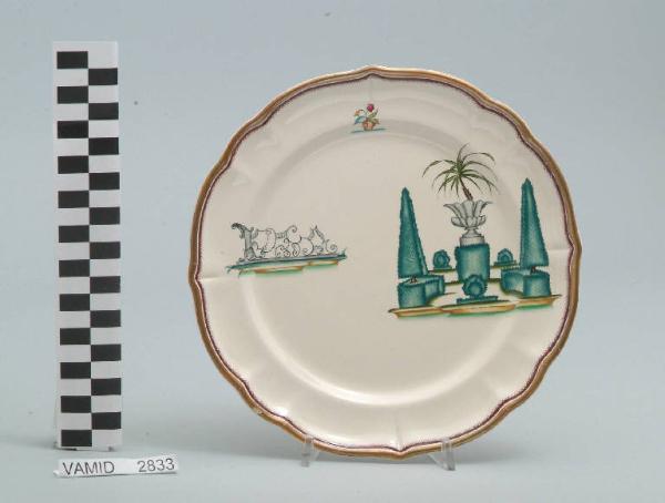 • NOTIZIE STORICO CRITICHE Il piatto da frutta in esame fa parte del servizio forma "Vecchio Milano" con decoro "Lago Maggiore": vi è raffigurata una veduta di un giardino all'italiana con cipressi e siepi di bossolo potati secondo l'ars topiaria ed elementi decorativi come un grande vaso in pietra contenente una palma nana. Insieme alla veduta sono presenti altri due decori in riferimento ai giardini del lago: un'inferriata in ferro battuto in stile Settecento (forse una recinzione) e un vaso di coccio con una pianta floreale. Per il suo clima mite e la posizione amena e soleggiata il Lago Maggiore è da sempre luogo di ville e di giardini splendidi come il grandioso giardino barocco all'italiana dell'Isola Bella o quello stupendo in stile inglese dell'Isola Madre o, ancora, quelli che attorniano molte ville storiche come la villa Pallavicini a Stresa, la Villa De Angeli Frua a Laveno o quella Bozzolo a Casalzuigno. Inevitabile che Andlovitz cogliesse in questi affascinanti insiemi di natura, arte e paesaggio una delle peculiarità più interessanti del Lago da riproporre in svariate declinazioni sul suo straordinario servizio. Questi decori sono rappresentati in un'atmosfera sospesa e silenziosa, seppur ridente nella resa stilizzata e nel fresco cromatismo delle raffigurazioni. Fin dalla sua nomina a direttore artistico della "S.C.I.", Guido Andlovitz si prefisse di rigenerare le forme tradizionali con decori nuovi. E' il caso della forma "Vecchio Milano" cui adattò nel 1931 il nuovissimo decoro "Lago Maggiore", a conferma che una decorazione nuova, se concepita organicamente, può conferire un aspetto attuale e "scattante" anche a una bella forma tradizionale. Fu certamente uno dei servizi più prestigiosi della produzione del momento se Andlovitz lo concepì in piccolissima serie e se l'azienda gli consentì - caso unico- di firmarlo nella marca. La scritta Verbano e la data 1931 presenti nel marchio suggeriscono che probabilmente il servizio fu realizzato per celebrare nel 1931 l'inizio della produzione di porcellana da tavola a Laveno nello stabilimento Verbano. Nell'ambito dei repertori decorativi creati dall'Andlovtz il decoro "Lago Maggiore" rappresenta un modo frazionato di raffigurare il paesaggio, definito da Mario Munari a "scena spezzata". L'impianto decorativo di queste ceramiche rifugge dalla centralità e dalla strutturazioni lungo diretrici ortogonali, mentre vi predominano l'asimmetria e le fughe visuali sghembe che risentono del gusto per la cineseria e il giapponismo. La semplificazione geometrica degli elementi e il modo di sfumare i corpi nel'intento di suggerirne la volumetria ricorda le opere di Carlo Carrà degli anni venti. Nel decoro "Lago Maggiore" sono presenti espressioni diversificate di un tema molto caro a Guido Andlovitz: i "paesaggi d'acqua" con particolare ricorrenza delle 'barche' raffigurate in una vasta gamma di tipi, generalmente riprese da modelli reali e con divertenti variazioni fantastiche. Il decoro Lago fu applicato in un primo momento sulla forma "Vecchio Milano", poi sulla forma "Pomezia" (1936 ca.). Del decoro Lago esistono diversi disegni originali a matita, pastello, inchiostro e acquerello su carta conservati nel fondo archivistico della "S.C.I.": alcuni di questi raffigurano il decoro proprio sulla forma "Vecchio Milano" con le rifiniture che compaiono sui pezzi finiti. Nel Museo è conservato anche un altro servizio forma "Vecchio Milano" con decoro "Lago Maggiore", ma più ridotto nella quantità e nella varietà dei componenti e con filettatura monocroma (num. inv. 2051...3517). Negli anni '90 la Richard Ginori ha rimesso in produzione il servizio Lago.\nIl servizio in esame è eseguito a colaggio, mentre i decori sono realizzati a decalcomania (o transfer): si vedano in proposito le lastre in rame acciaiato conservate nel Museo e raffiguranti molti dei decori presenti nel servizio in combinazioni diversificate (nn. inv. 2480, 2483, 2484, 2485). Tipologicamente si lega ad un servizio da caffé (num. inv. 2672...