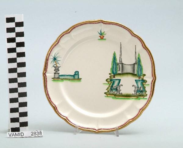 - NOTIZIE STORICO CRITICHE Il piatto da frutta in esame fa parte del servizio forma "Vecchio Milano" con decoro "Lago Maggiore": vi è raffigurata una veduta di un giardino all'italiana con un'esedra in muratura sullo sfondo con obelischi, cipressi e siepi di bossolo potati secondo l'ars topiaria. Insieme alla veduta sono presenti altri due decori in riferimento ai giardini del lago: una siepe di bosso con un vaso decorativo con palmizio e un vaso di coccio con una pianta ornamentale. Per il suo clima mite e la posizione amena e soleggiata il Lago Maggiore è da sempre luogo di ville e di giardini splendidi come il grandioso giardino barocco all'italiana dell'Isola Bella o quello stupendo in stile inglese dell'Isola Madre o, ancora, quelli che attorniano molte ville storiche come la villa Pallavicini a Stresa, la Villa De Angeli Frua a Laveno o quella Bozzolo a Casalzuigno. Inevitabile che Andlovitz cogliesse in questi affascinanti insiemi di natura, arte e paesaggio una delle peculiarità più interessanti del Lago da riproporre in svariate declinazioni sul suo straordinario servizio. Questi decori sono rappresentati in un'atmosfera sospesa e silenziosa, seppur ridente nella resa stilizzata e nel fresco cromatismo delle raffigurazioni. Fin dalla sua nomina a direttore artistico della "S.C.I.", Guido Andlovitz si prefisse di rigenerare le forme tradizionali con decori nuovi. E' il caso della forma "Vecchio Milano" cui adattò nel 1931 il nuovissimo decoro "Lago Maggiore", a conferma che una decorazione nuova, se concepita organicamente, può conferire un aspetto attuale e "scattante" anche a una bella forma tradizionale. Fu certamente uno dei servizi più prestigiosi della produzione del momento se Andlovitz lo concepì in piccolissima serie e se l'azienda gli consentì - caso unico- di firmarlo nella marca. La scritta Verbano e la data 1931 presenti nel marchio suggeriscono che probabilmente il servizio fu realizzato per celebrare nel 1931 l'inizio della produzione di porcellana da tavola a Laveno nello stabilimento Verbano. Nell'ambito dei repertori decorativi creati dall'Andlovtz il decoro "Lago Maggiore" rappresenta un modo frazionato di raffigurare il paesaggio, definito da Mario Munari a "scena spezzata". L'impianto decorativo di queste ceramiche rifugge dalla centralità e dalla strutturazioni lungo diretrici ortogonali, mentre vi predominano l'asimmetria e le fughe visuali sghembe che risentono del gusto per la cineseria e il giapponismo. La semplificazione geometrica degli elementi e il modo di sfumare i corpi nel'intento di suggerirne la volumetria ricorda le opere di Carlo Carrà degli anni venti. Nel decoro "Lago Maggiore" sono presenti espressioni diversificate di un tema molto caro a Guido Andlovitz: i "paesaggi d'acqua" con particolare ricorrenza delle 'barche' raffigurate in una vasta gamma di tipi, generalmente riprese da modelli reali e con divertenti variazioni fantastiche. Il decoro Lago fu applicato in un primo momento sulla forma "Vecchio Milano", poi sulla forma "Pomezia" (1936 ca.). Del decoro Lago esistono diversi disegni originali a matita, pastello, inchiostro e acquerello su carta conservati nel fondo archivistico della "S.C.I.": alcuni di questi raffigurano il decoro proprio sulla forma "Vecchio Milano" con le rifiniture che compaiono sui pezzi finiti. Nel Museo è conservato anche un altro servizio forma "Vecchio Milano" con decoro "Lago Maggiore", ma più ridotto nella quantità e nella varietà dei componenti e con filettatura monocroma (num. inv. 2051...3517). Negli anni '90 la Richard Ginori ha rimesso in produzione il servizio Lago.\nIl servizio in esame è eseguito a colaggio, mentre i decori sono realizzati a decalcomania (o transfer): si vedano in proposito le lastre in rame acciaiato conservate nel Museo e raffiguranti molti dei decori presenti nel servizio in combinazioni diversificate (nn. inv. 2480, 2483, 2484, 2485). Tipologicamente si lega ad un servizio da caffé (num. inv. 2672...2900).\nIl piatto da frutta è stato donato da