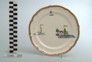 - NOTIZIE STORICO CRITICHE Il piatto da frutta in esame fa parte del servizio forma "Vecchio Milano" con decoro "Lago Maggiore": vi sono raffigurati uno scorcio (un fortino con bandiera italiana sulla riva del lago) ed elementi caratteristici della vita sul lago (una boa luminosa e una barca da pesca tipica, detta burchiello, in navigazione) rappresentati in un'atmosfera sospesa e silenziosa, seppur ridente nella resa stilizzata e nel fresco cromatismo delle raffigurazioni. Fin dalla sua nomina a direttore artistico della "S.C.I.", Guido Andlovitz si prefisse di rigenerare le forme tradizionali con decori nuovi. E' il caso della forma "Vecchio Milano" cui adattò nel 1931 il nuovissimo decoro "Lago Maggiore", a conferma che una decorazione nuova, se concepita organicamente, può conferire un aspetto attuale e "scattante" anche a una bella forma tradizionale. Fu certamente uno dei servizi più prestigiosi della produzione del momento se Andlovitz lo concepì in piccolissima serie e se l'azienda gli consentì - caso unico- di firmarlo nella marca. La scritta Verbano e la data 1931 presenti nel marchio suggeriscono che probabilmente il servizio fu realizzato per celebrare nel 1931 l'inizio della produzione di porcellana da tavola a Laveno nello stabilimento Verbano. Nell'ambito dei repertori decorativi creati dall'Andlovtz il decoro "Lago Maggiore" rappresenta un modo frazionato di raffigurare il paesaggio, definito da Mario Munari a "scena spezzata". L'impianto decorativo di queste ceramiche rifugge dalla centralità e dalla strutturazioni lungo diretrici ortogonali, mentre vi predominano l'asimmetria e le fughe visuali sghembe che risentono del gusto per la cineseria e il giapponismo. La semplificazione geometrica degli elementi e il modo di sfumare i corpi nel'intento di suggerirne la volumetria ricorda le opere di Carlo Carrà degli anni venti. Nel decoro "Lago Maggiore" sono presenti espressioni diversificate di un tema molto caro a Guido Andlovitz: i "paesaggi d'acqua" con particolare ricorrenza delle 'barche' raffigurate in una vasta gamma di tipi, generalmente riprese da modelli reali e con divertenti variazioni fantastiche. Il decoro Lago fu applicato in un primo momento sulla forma "Vecchio Milano", poi sulla forma "Pomezia" (1936 ca.). Del decoro Lago esistono diversi disegni originali a matita, pastello, inchiostro e acquerello su carta conservati nel fondo archivistico della "S.C.I.": alcuni di questi raffigurano il decoro proprio sulla forma "Vecchio Milano" con le rifiniture che compaiono sui pezzi finiti. Nel Museo è conservato anche un altro servizio forma "Vecchio Milano" con decoro "Lago Maggiore", ma più ridotto nella quantità e nella varietà dei componenti e con filettatura monocroma (num. inv. 2051...3517). Negli anni '90 la Richard Ginori ha rimesso in produzione il servizio Lago.\nIl servizio in esame è eseguito a colaggio, mentre i decori sono realizzati a decalcomania (o transfer): si vedano in proposito le lastre in rame acciaiato conservate nel Museo e raffiguranti molti dei decori presenti nel servizio in combinazioni diversificate (nn. inv. 2480, 2483, 2484, 2485). Tipologicamente si lega ad un servizio da caffé (num. inv. 2672...2900).\nIl piatto da frutta è stato donato da Vanna Scotti Meregalli, nipote di Vanna Scotti, figlia dell'Ing. Luciano Scotti che fu direttore generale della "S.C.I." dal 1916.