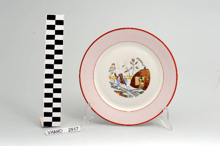 - NOTIZIE STORICO CRITICHE Il piatto piano, che si accompagna ad altri tre elementi (nn. inv. 2915, 2922, 2923), fu realizzato in porcellana bianca smaltata con filettature rosse sulla tesa a delimitazione di una fascia di colore rosa e da una vignetta a decalcomania sopravernice illustrante la fiaba della cicala e della formica di Esopo, adattata anche da Jean de la Fontaine. Nel disegno, stilizzato e molto colorato per attirare l'attenzione dei bambini, vi sono delle strette affinità con le tipologie disegnative presenti nei contemporanei fumetti e cartoni animati per l'infanzia. Lo stabilimento Verbano di Laveno, costruito nel 1924 per la fabbricazione di isolatori in porcellana sulla base di un'intesa con la Porzellanfabrik Rosenthal di Selb (Baviera), iniziò la produzione di porcellana da tavola nel 1931: tale produzione cessò nel 1966.