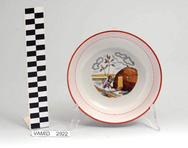 - NOTIZIE STORICO CRITICHE Il piatto fondo, che si accompagna ad altri tre elementi (nn. inv. 2915, 2917, 2923), fu realizzato in porcellana bianca smaltata con filettature rosse sulla tesa a delimitazione di una fascia di colore rosa e con una vignetta a decalcomania sopravernice illustrante la fiaba della cicala e della formica di Esopo, adattata anche da Jean de la Fontaine. Nel disegno, stilizzato e molto colorato per attirare l'attenzione dei bambini, vi sono delle strette affinità con le tipologie disegnative presenti nei contemporanei fumetti e cartoni animati per l'infanzia. Lo stabilimento Verbano di Laveno, costruito nel 1924 per la fabbricazione di isolatori in porcellana sulla base di un'intesa con la Porzellanfabrik Rosenthal di Selb (Baviera), iniziò la produzione di porcellana da tavola nel 1931: tale produzione cessò nel 1966.